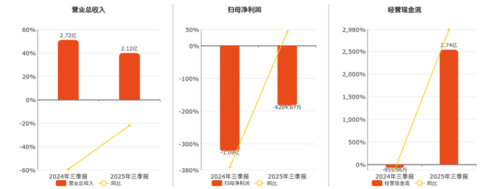 公司营业总收入为2.12亿元。归母净利润为-6204.67万元,较去年同报告期归母净利润增加4681.04万元。经营活动现金净流入为2.74亿元,在已披露的同业公司中排名第1,较去年同报告期经营活动现金净流入增加2.84亿元。