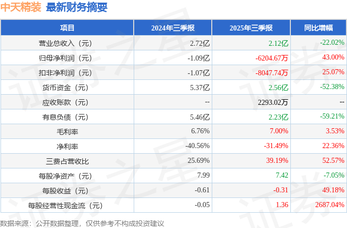 中天精装(002989)2025年三季报简析:亏损收窄,三费占比上升明显