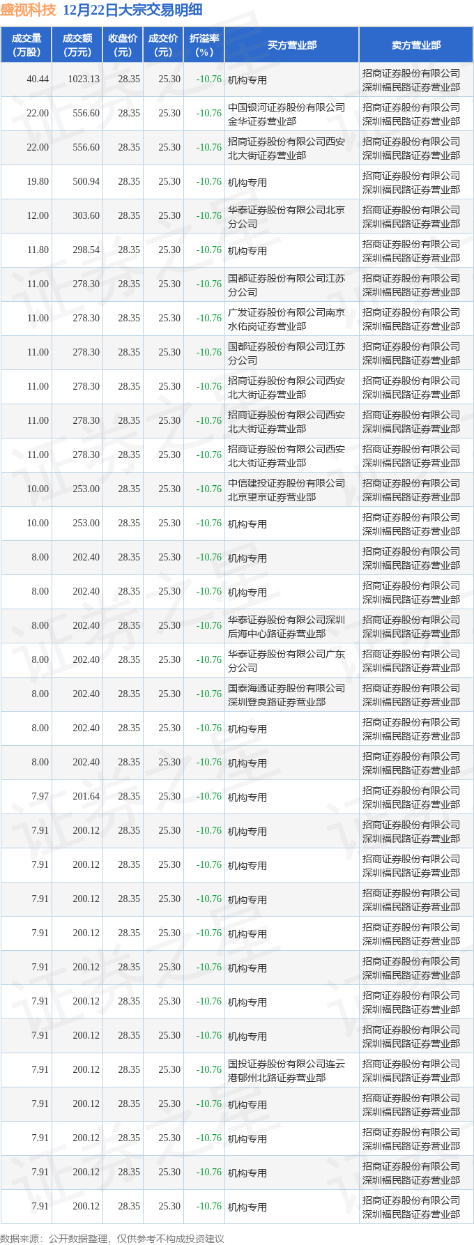 12月22日盛视科技现34笔折价10.76%的大宗交易 合计成交9435.09万元