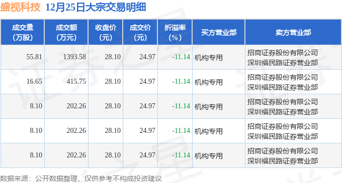 12月25日盛视科技现5笔折价11.14%的大宗交易 合计成交2416.11万元