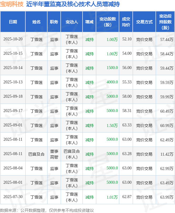 宝明科技近半年内的董监高及核心技术人员增减持详情如下: