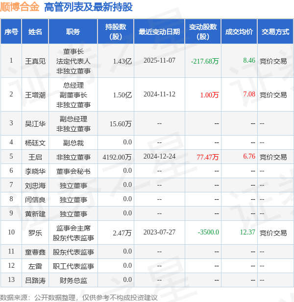 顺博合金近半年内的董监高及核心技术人员增减持详情如下: