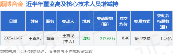 顺博合金:11月7日高管王真见减持股份合计217.68万股