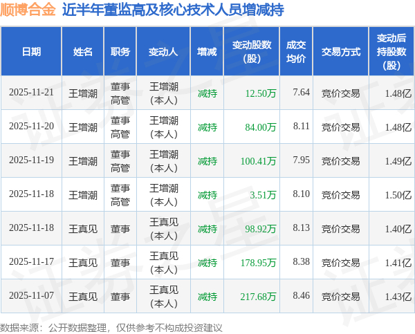 顺博合金:11月21日高管王增潮减持股份合计12.5万股