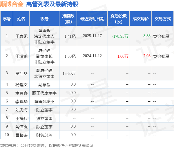 证券之星消息,根据11月24日市场公开信息、上市公司公告及交易所披露数据整理,顺博合金(002996)最新董监高及相关人员股份变动情况:2025年11月21日公司董事,高管王增潮共减持公司股份12.5万股,占公司总股本为0.0187%。变动期间公司股价下跌7.99%,11月21日当日收盘报7.37元。