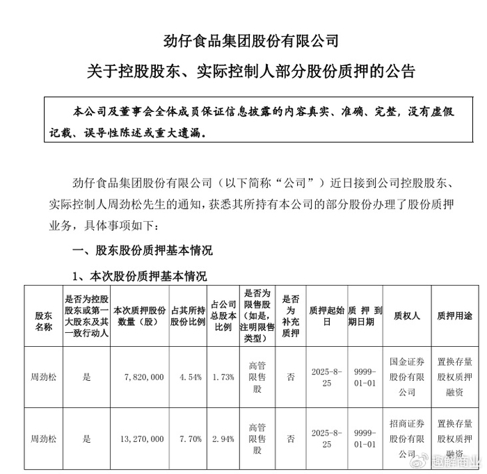 值得注意的是,披露半年报的同时,劲仔食品还发布了实控人股权质押公告。公告显示,劲仔食品实控人周劲松及其一致行动人李冰玉(周劲松之妻)合计持有公司20853.58万股、46.23%的股份,本次质押2109万股股份,质押用途为置换存量股权质押融资。
