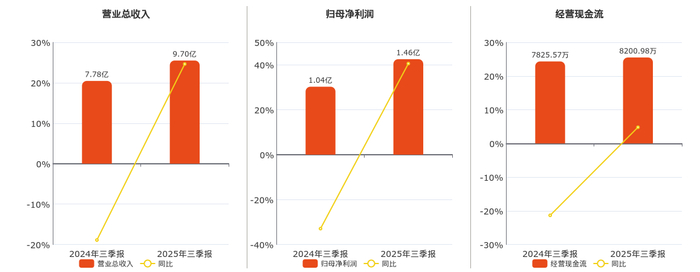 公司营业总收入为9.70亿元。归母净利润为1.46亿元。经营活动现金净流入为8200.98万元。