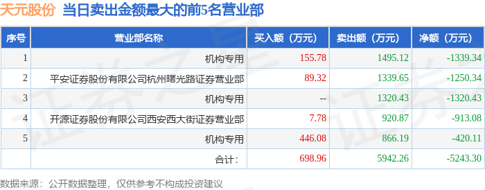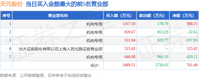 12月26日天元股份(003003)龙虎榜数据:机构净卖出2421.72万元