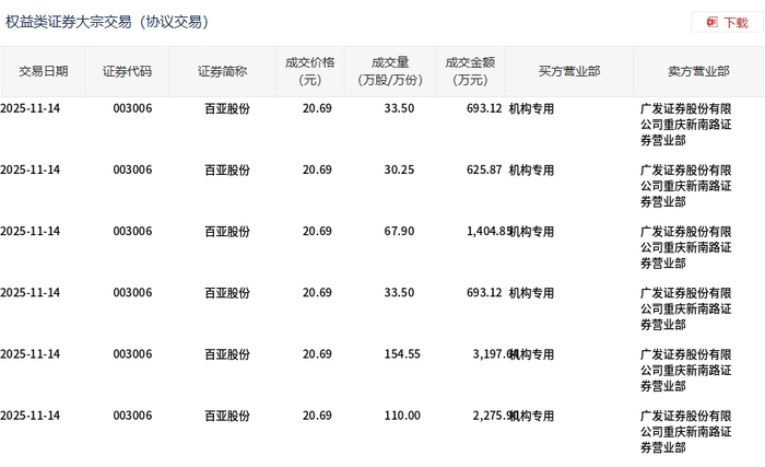 百亚股份今日大宗交易折价成交429.7万股,成交额8890.5万元