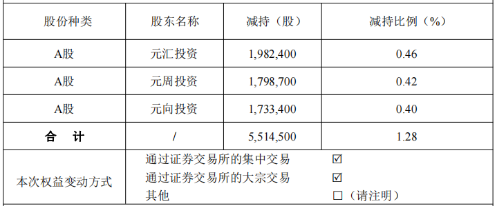 近日,公司分别收到公司控股股东、实际控制人的一致行动人元汇投资、元周投资和元向投资出具的《关于股份减持计划实施情况的告知函》。元汇投资、元周投资和元向投资自2025年11月10日至2025年11月14日通过集中竞价交易和大宗交易方式累计减持公司股份5,514,500股,占公司总股本的1.28%。本次权益变动后,公司控股股东、实际控制人及一致行动人元汇投资、元周投资和元向投资合计持有公司股份占公司总股本的比例由49.41%降至48.13%,权益变动触及1%的整数倍。