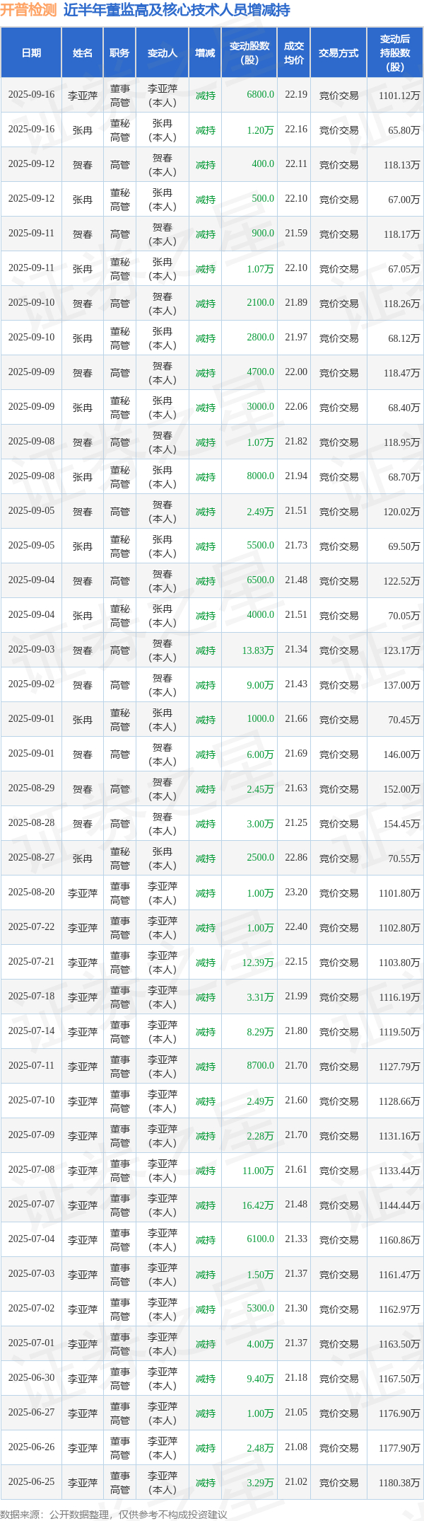 开普检测近半年内的董监高及核心技术人员增减持详情如下: