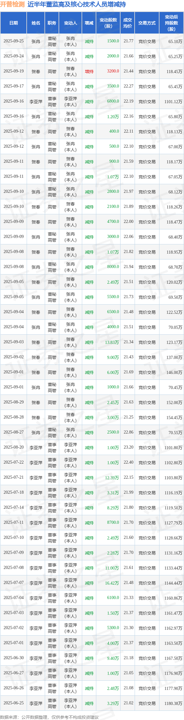 开普检测近半年内的董监高及核心技术人员增减持详情如下: