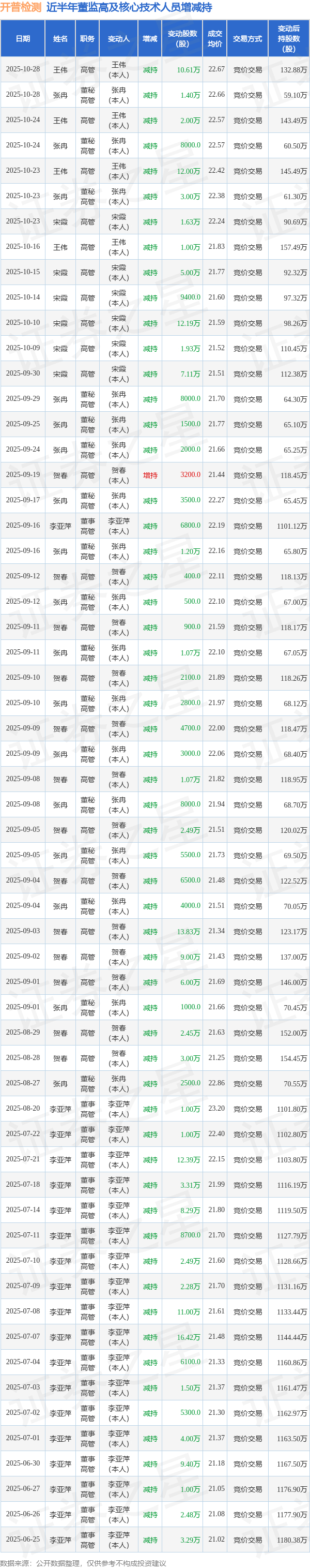 开普检测近半年内的董监高及核心技术人员增减持详情如下: