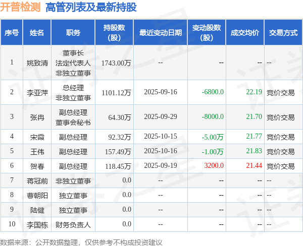 证券之星消息,根据10月30日市场公开信息、上市公司公告及交易所披露数据整理,开普检测(003008)最新董监高及相关人员股份变动情况:2025年10月29日公司董事姚致清共减持公司股份15.6万股,占公司总股本为0.15%。变动期间公司股价下跌1.94%,10月29日当日收盘报22.24元。