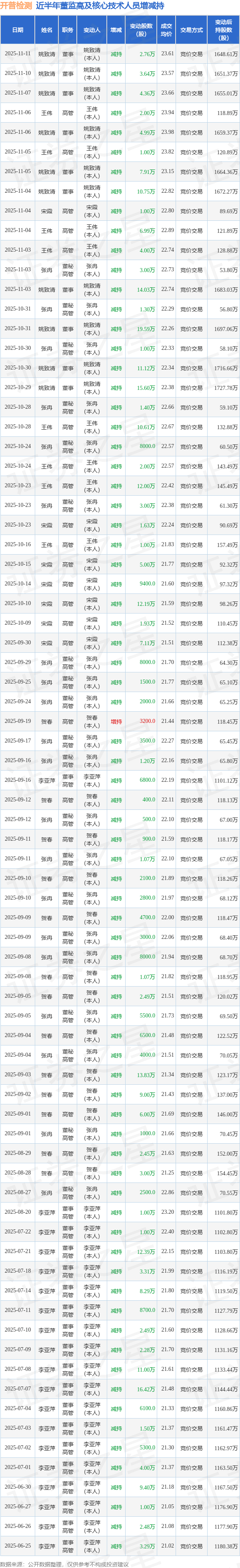 开普检测近半年内的董监高及核心技术人员增减持详情如下: