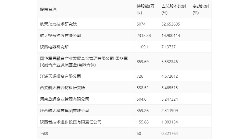 年报显示,2023年年末公司十大流通股东中,新进股东为航天动力技术研究院、航天投资控股有限公司、陕西电器研究所、国华军民融合产业发展基金管理有限公司-国华军民融合产业发展基金(有限合伙)、洋浦天塬投资有限公司、西安航天复合材料研究所、陕西航天科技集团有限公司、陕西省技术进步投资有限责任公司、马啸,取代了三季度末的陈裕良、国泰中证军工交易型开放式指数证券投资基金、富国中证军工指数型证券投资基金、广发中证军工交易型开放式指数证券投资基金、徐康宁、王依倩、香港中央结算有限公司、邓子德、陈秋华。在具体持股比例上,河南鸢辉企业管理有限公司持股有所下降。