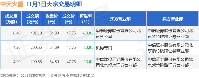 11月3日中天火箭现3笔折价13.01%的大宗交易 合计成交802.2万元