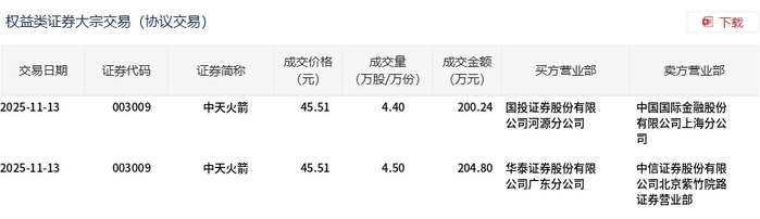 11月13日,中天火箭大宗交易成交8.9万股,成交额405.04万元,占当日总成交额的2.21%,成交价45.51元,较市场收盘价51.09元折价10.92%。