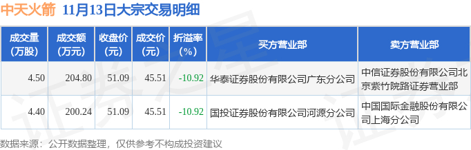 11月13日中天火箭现2笔折价10.92%的大宗交易 合计成交405.04万元