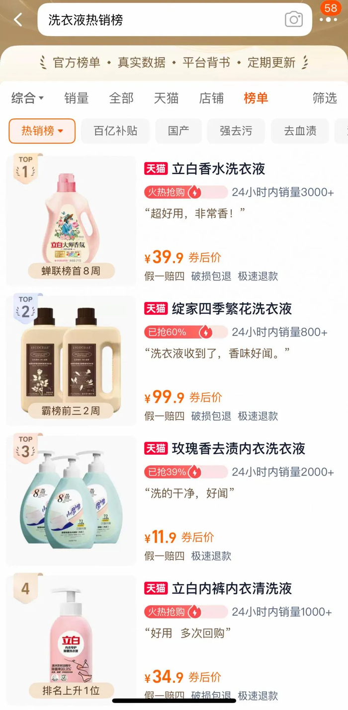 截至2025年9月21日,这款产品在天猫洗衣液热销榜(按近7天销量与销售额排序)中排名第二,第一名是与绽家产品重量相近的立白,虽然同样打上了“香水”的标记,售价却仅为39.9元。