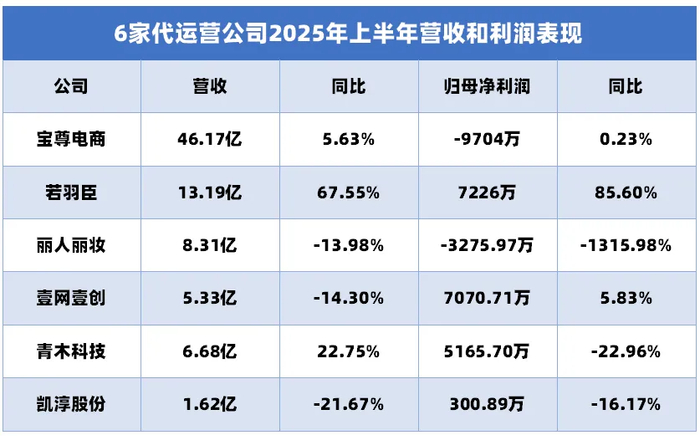 且横向对比行业竞争对手,若羽臣今年上半年业绩优势更为显著,为六家上市电商代运营公司中唯一一家实现营收和净利双增的。宝尊电商营收规模上虽然在6家里规模比其他5家之和还要大,但是还处于亏损状态;丽人丽妆、凯淳股份业绩双降;壹网壹创增利不增收、青木科技增收不增利。
