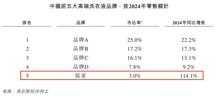 以其王牌产品高端洗衣液为例,消费者在追求功能性表现的同时,日益追求情绪价值及身份认同,故高端洗衣液(即每1000毫升定价人民币50元或以上的洗衣液)成为快速发展的细分市场。2024年,按零售额计,在中国高端洗衣液细分市场中,绽家排名第五。