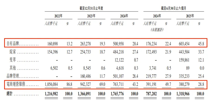 转折发生在上市同年,若羽臣启动战略转型,从"渠道服务商"向"品牌平台"升级,打造自有品牌作为第二增长曲线。历经五年探索,转型成效已清晰显现。2025年上半年,其自有品牌实现营收6.03亿元,同比激增242.42%,收入占比提升至45.8%,首次超越传统代运营业务,成为核心增长引擎。