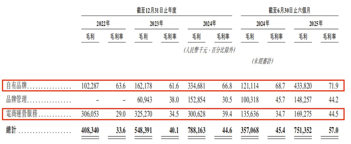 至于这样做的原因,其实也很简单,价格高意味着毛利率高,能赚更多的钱。数据显示,若羽臣综合毛利率从2022年的33.6%逐年增长至2025年6月末的57%,其中自有品牌(即销售绽家及斐萃产品)贡献了绝对增量,具有相对更高的毛利率,从同期的63.6%上升至高达71.9%,已经远远超过传统电商代运营业务44.5%毛利率。