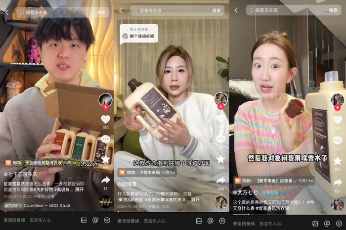 绽家几乎是以香水香氛的方式重新做了一遍洗液产品,而在反复强化的“香味不输大牌香水、72小时留香”的卖点中,消费者也以香型为导向选择洗衣液。从这个味道上,用洗衣产品的价格享受到比肩大牌的香味享受,反倒了成了一个高性价比的消费行为。