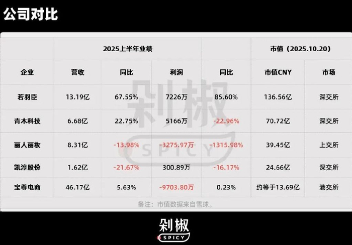 对比这些同类型背景的公司,剁椒Spicy观察发现,若羽臣虽然营收并不算拔尖,当下的市值反而遥遥领先,已超过130亿人民币。