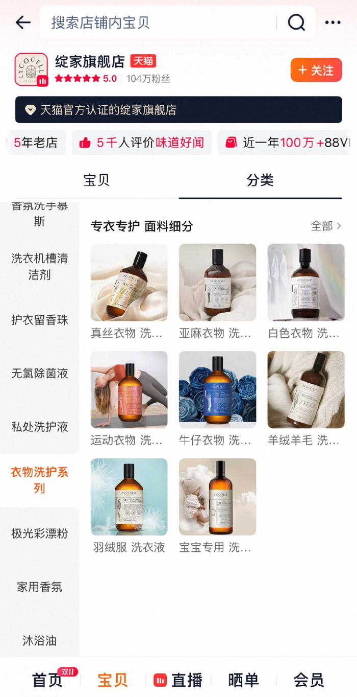 在产品线上,绽家强调专衣专护,根据使用场景、衣物类型细分了产品线。除了衣物除菌、洗衣凝珠、香氛喷雾等功能性产品的区分,针对真丝、羊绒、亚麻、羽绒服、宝宝专用等不同材质的衣物也推出了相应的产品。这种高度细分的产品线,本身就代表着专业与高端。