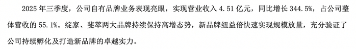 值得一提的是,公司自有品牌业务表现亮眼,实现营业收入4.51亿元,同比增长344.5%,占公司整体营收的55.1%。绽家、斐萃两大品牌持续保持高增态势,新品牌纽益倍快速实现规模放量。