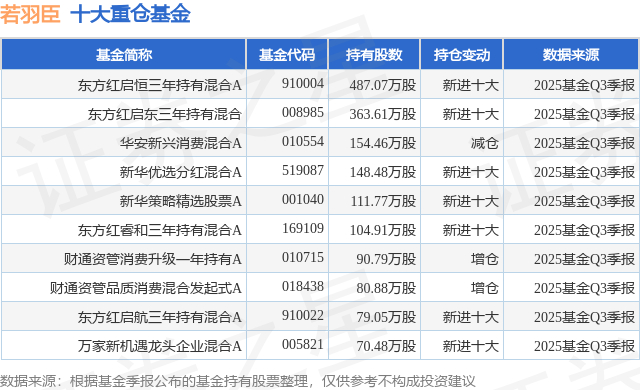 根据2025基金Q3季报公募基金重仓股数据,重仓该股的公募基金共49家,其中持有数量最多的公募基金为东方红资产管理的东方红启恒三年持有混合A。东方红启恒三年持有混合A目前规模为7.18亿元,最新净值10.5157(12月18日),较上一交易日下跌0.82%,近一年上涨11.68%。该公募基金现任基金经理为胡晓 李竞。李竞在任的基金产品包括:东方红启东三年持有混合,管理时间为2020年3月16日至今,期间收益率为54.56%;东方红启航三年持有混合A,管理时间为2020年10月29日至今,期间收益率为5.26%;东方红睿和三年持有混合A,管理时间为2021年12月2日至今,期间收益率为-15.63%;东方红ESG可持续投资混合A,管理时间为2022年3月2日至今,期间收益率为1.48%。胡晓在任的基金产品包括:东方红启兴三年持有混合A,管理时间为2024年2月8日至今,期间收益率为41.75%;东方红睿满沪港深混合(LOF)A,管理时间为2024年4月27日至今,期间收益率为39.29%;东方红港股通价值优选混合发起A,管理时间为2025年6月17日至今,期间收益率为3.91%。
