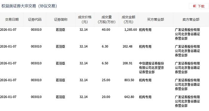1月7日,若羽臣大宗交易成交97.8万股,成交额3143.29万元,占当日总成交额的10.48%,成交价32.14元,较市场收盘价36.16元折价11.12%。