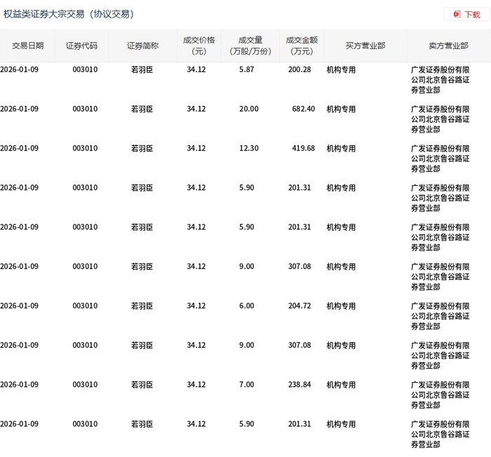 若羽臣今日大宗交易折价成交86.87万股,成交额2964.01万元