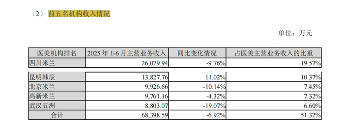 2025年上半年,朗姿股份医美业务营收13.3亿元,同比下降6.1%,核心医美机构的营业收入普遍出现负增长:主力子公司四川米兰柏羽医学美容医院有限公司营收同比下降9.8%,此前重金并购的武汉五洲整形外科医院有限公司更是同比下滑19.1%。