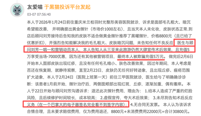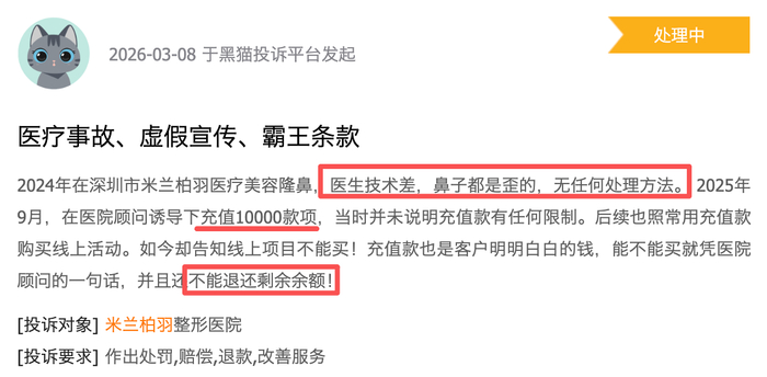 除了医疗安全事故,米兰柏羽在终端营销上的合规性同样面临拷问。3月7日,针对重庆米兰柏羽时光整形美容医院的一起投诉显示,消费者本欲进行常规的黄金微针项目,却在院方咨询顾问的诱导下,不仅接受了未被告知不良反应的“黑曜微针”高价项目,还被诱导充值高达5万元。术后,该消费者面部出现严重红斑与丘疹,且机构未能提供正规合同与发票,涉嫌虚假宣传与违规操作。紧接着在3月8日,深圳米兰柏羽又被指控隆鼻手术失败,且在诱导消费者充值1万元后,拒绝退还余额并单方面限制线上消费,被指存在“霸王条款”。