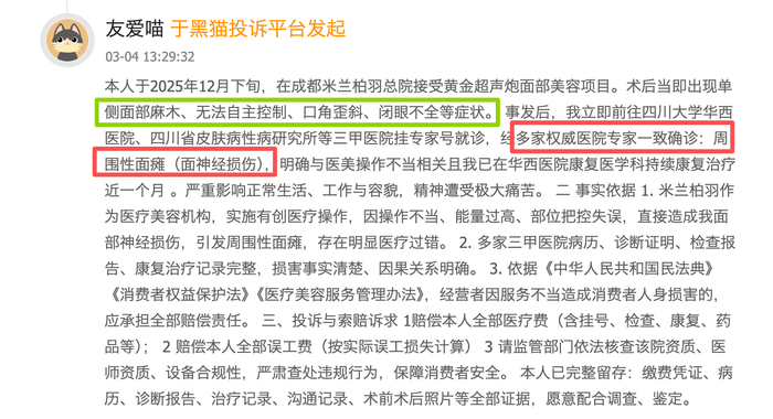 2026年3月初,黑猫投诉[下载黑猫投诉客户端]平台密集出现了多起针对米兰柏羽旗下机构的严重客诉。3月4日,有消费者实名投诉称,在成都米兰柏羽总院接受“黄金超声炮”面部美容项目后,当即出现单侧面部麻木、口角歪斜等症状,后经华西医院等三甲医院确诊为由医疗操作不当引发的周围性面瘫(面神经损伤)。该消费者不仅要求索赔,更明确呼吁监管部门依法核查该院资质与设备合规性。