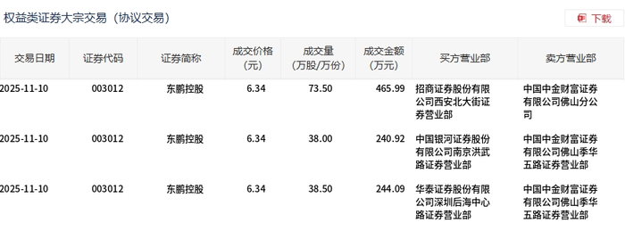 11月10日,东鹏控股大宗交易成交150万股,成交额951万元,占当日总成交额的13.6%,成交价6.34元,较市场收盘价7.11元折价10.83%。
