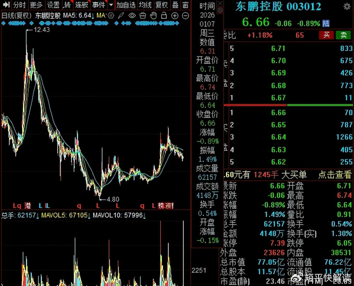 股价大跌,机构、散户均有所减少。二级市场上,东鹏控股股价下滑较为明显,从2023年12.43元/股(前复权,下同)的高点下滑至4.8元/股的低点,随后有所反弹,截至1月7日收盘,股价为6.66元/股,较高点下跌约46%,目前总市值不足百亿元,为77.05亿元,TTM市盈率20.89%,考虑到房地产业现状以及公司收入下滑的情形,估值并不算太低。