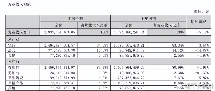进一步来看,瓷砖包括有釉砖、无釉砖,前者是收入重头,2024年、2025年上半年收入分别为52.59亿元、24.57亿元,同比下滑16.42%、1.97%,而无釉砖收入则是连续多年下滑,2022年至2025年上半年分别为4.26亿元、2.9亿元、1.29亿元、0.28亿元,同比分别下滑43.9%、31.93%、55.65%、61.32%,占比从6.14%下滑至0.96%。