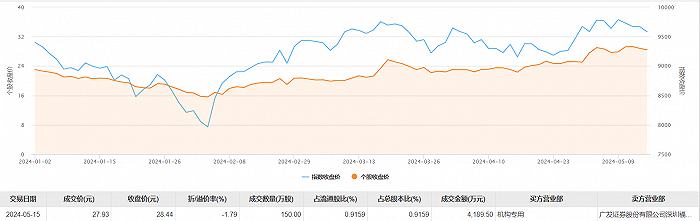 5月15日大宗交易成交150万股,成交额4189.5万元,占当日总成交额的27.72%,成交价27.93元,较市场收盘价28.44元折价1.79%。