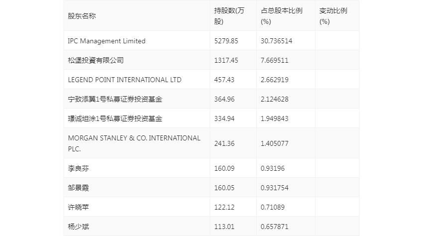 半年报显示,2024年上半年末公司十大流通股东中,新进股东为MORGAN STANLEY & CO. INTERNATIONAL PLC.、李良芬、邹景霞、许晓苹、杨少斌,取代了一季度末的千惠扬帆1号私募证券投资基金、许文娣、田赣生、海富通改革驱动灵活配置混合型证券投资基金、王征。在具体持股比例上,璟诚坦涂1号私募证券投资基金持股有所上升,IPC Management Limited、松堡投資有限公司、LEGEND POINT INTERNATIONAL LTD、宁致添翼1号私募证券投资基金持股有所下降。