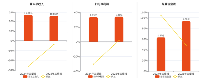 公司营业总收入为10.81亿元,较去年同报告期营业总收入减少4442.93万元,同比较去年同期下降3.95%。归母净利润为1.21亿元。经营活动现金净流入为1.88亿元。