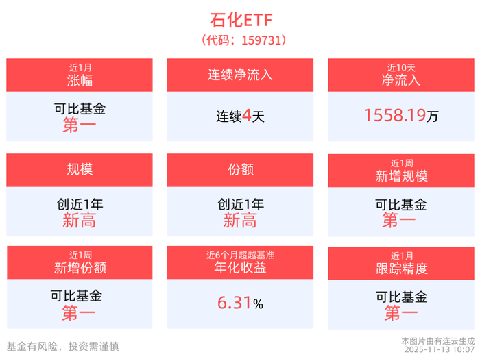 截至11月12日,石化ETF近6月净值上涨27.44%。从收益能力看,截至2025年11月12日,石化ETF自成立以来,最高单月回报为15.86%,最长连涨月数为6个月,最长连涨涨幅为23.51%,上涨月份平均收益率为5.06%。截至2025年11月12日,石化ETF近6个月超越基准年化收益为6.31%。