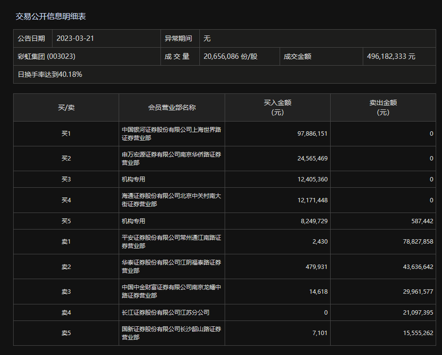 3月21日,彩虹集团今日涨7.39%,龙虎榜数据显示,上榜营业部席位全天成交3.45亿元,占当日总成交金额比例为69.62%。其中,买入金额为1.56亿元,卖出金额为1.9亿元,合计净卖出3388.39万元。具体来看,机构买入2065.51万元,卖出58.74万元,合计净买入2006.76万元。此外,中国银河证券上海世界路证券营业部、申万宏源证券有限公司南京华侨路证券营业部分别买入9788.62万元、2456.55万元;平安证券常州通江南路证券营业部、华泰证券江阴福泰路证券营业部分别卖出7882.79万元、4363.66万元。