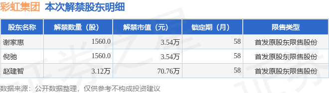 彩虹集团(003023)3.43万股限售股将于9月30日解禁,占总股本0.03%