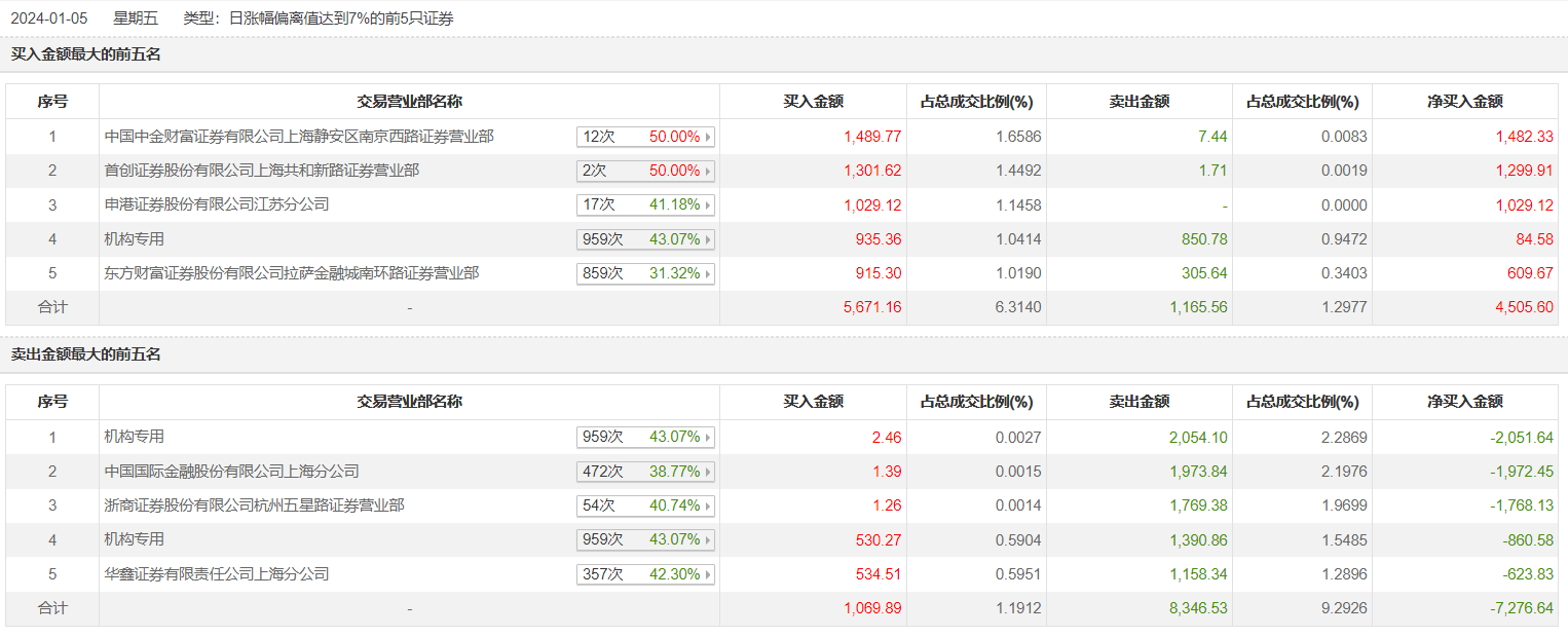 思进智能1月5日涨停,全天换手率达24.29%,振幅达8.8%。龙虎榜数据显示,营业部席位合计净卖出2771.04万元。其中,机构买入1468.09万元,卖出4295.74万元,合计净卖出2827.65万元。此外,中国中金财富证券有限公司上海静安区南京西路证券营业部、首创证券上海共和新路证券营业部分别买入1489.77万元、1301.62万元;中国国际金融上海分公司、浙商证券杭州五星路证券营业部分别卖出1973.84万元、1769.38万元。