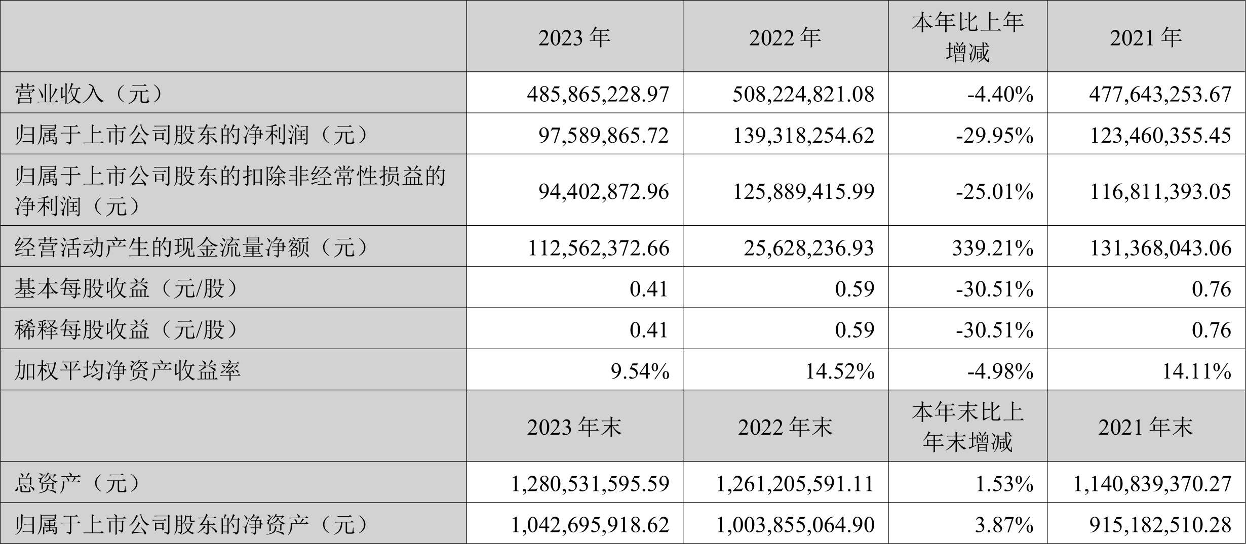 中证智能财讯 思进智能(003025)4月27日披露2023年年报。2023年,公司实现营业总收入4.86亿元,同比下降4.40%;归母净利润9758.99万元,同比下降29.95%;扣非净利润9440.29万元,同比下降25.01%;经营活动产生的现金流量净额为1.13亿元,同比增长339.21%;报告期内,思进智能基本每股收益为0.41元,加权平均净资产收益率为9.54%。公司2023年年度利润分配预案为:拟向全体股东每10股派2元(含税)。