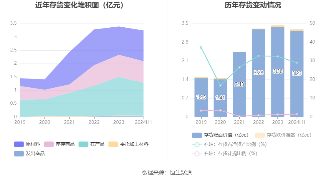 从存货变动来看,截至2024年上半年末,公司存货账面价值为3.23亿元,占净资产的28.98%,较上年末减少1467.94万元。其中,存货跌价准备为486.57万元,计提比例为1.48%。